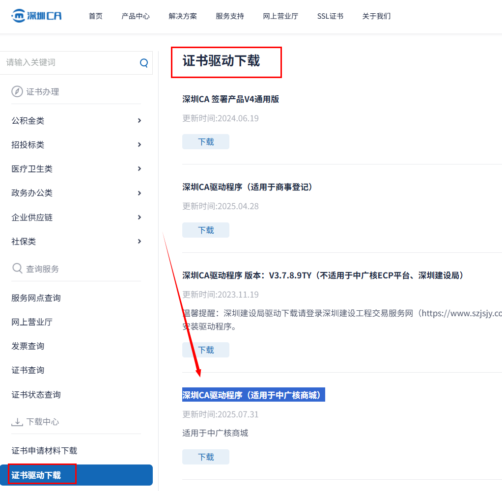 答:1. 请确认驱动是否安装的是中广核电子商城专用驱动,登录深圳CA官网→【服务支持】→【下载中心】→【证书驱动下载】→下载并安装【深圳CA驱动程序(适用于中广核电子商城)】。