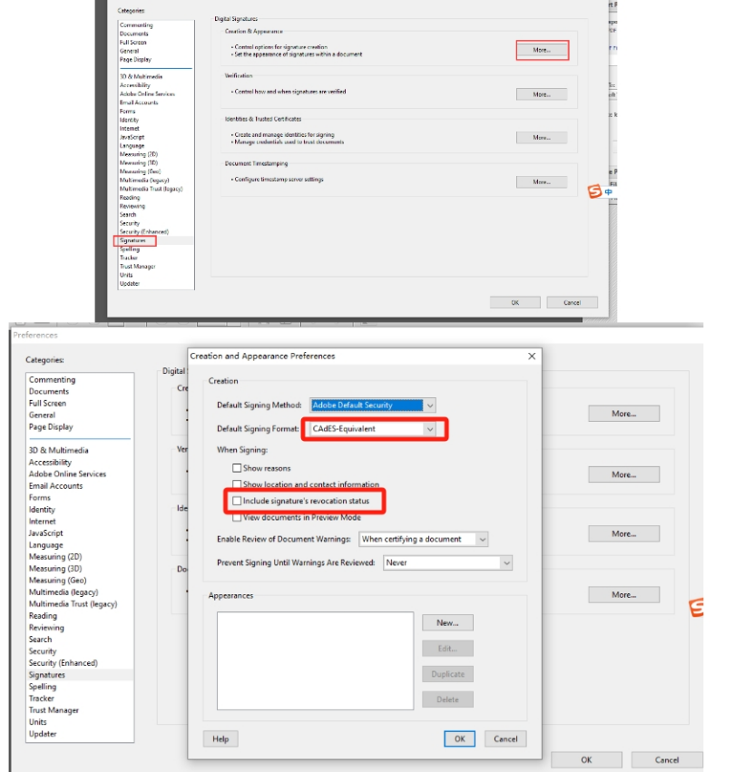 答:点击左上角的【菜单】/【编辑】→【首选项】→【签名】→【创建和外观】→【更多】,默认签名格式选择为【CAdeS对等】,【包括签名吊销状态】勾选去掉。