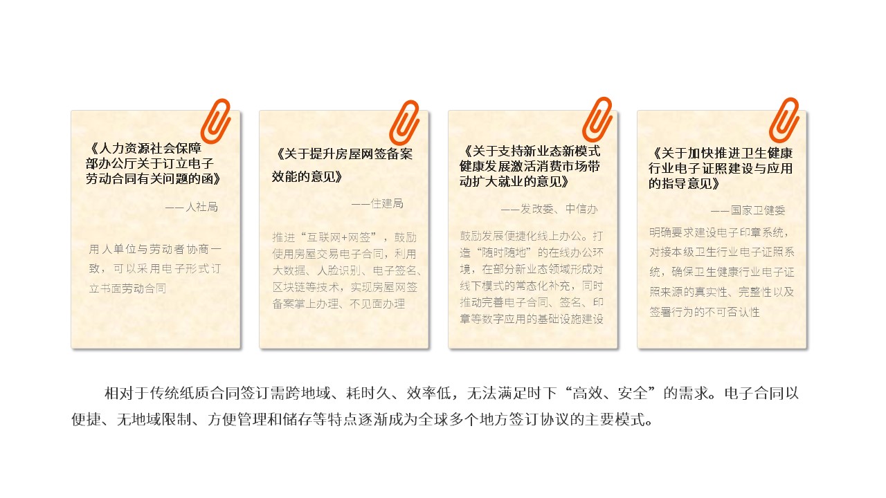 相对于传统纸质合同签订需跨地域、效率低、耗时久,无法满足当下“高效、安全”的需求。电子合同以便捷、无地域限制、方便管理和存储等特点逐渐成为全球多个地方签订协议的主要模式。