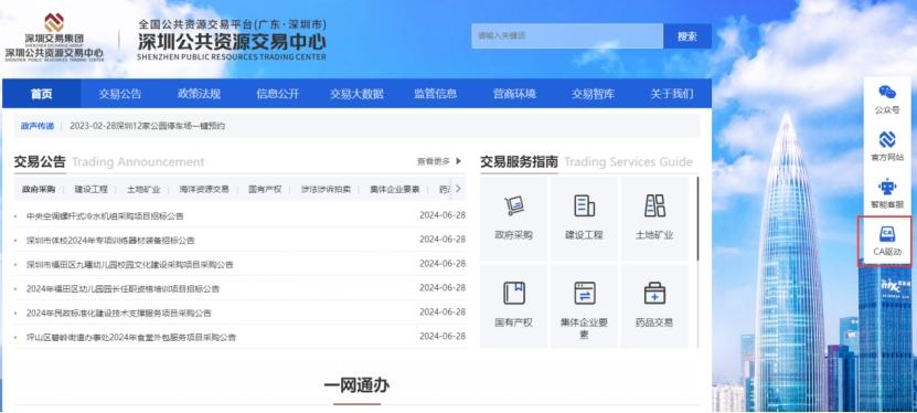(一) 登录深圳公共资源交易中心官网(https://www.szggzy.com/static/index.html)→【CA驱动】→需同时下载【深圳交易集团CA互通平台驱动 (*必须下载)】、【深圳市电子商务安全证书管理有限公司(深圳CA)】→点击【立即下载】。