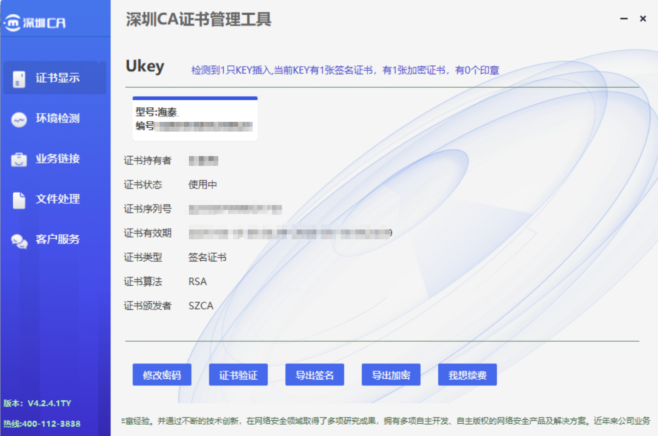 修改密码: 插入数字证书U-KEY→电脑桌面自动显示深圳CA管理工具,识别证书所有者、有效期等信息→点击页面下方【修改密码】功能→依次输入旧密码及新密码,点击保存完成PIN密码的修改。