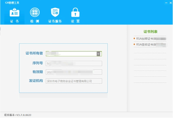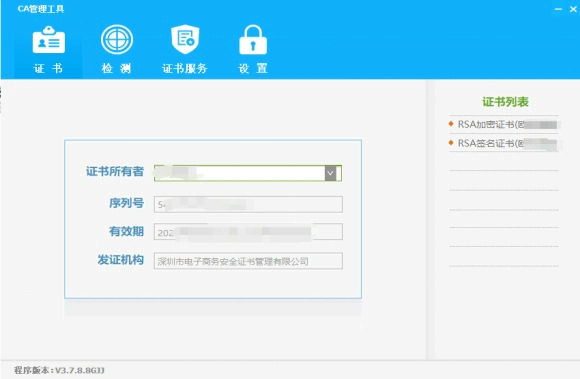 (三)安装成功后,双击打开桌面的【数字证书管理工具】,插入数字证书 Ukey 弹出深圳CA证书管理工具。