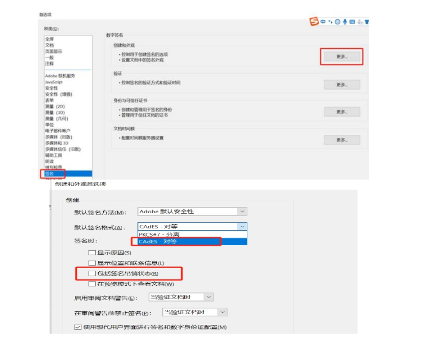 答:点击左上角的【菜单】/【编辑】→【首选项】→【签名】→【创建和外观】→【更多】,默认签名格式选择为【CAdeS对等】,【包括签名吊销状态】勾选去掉。