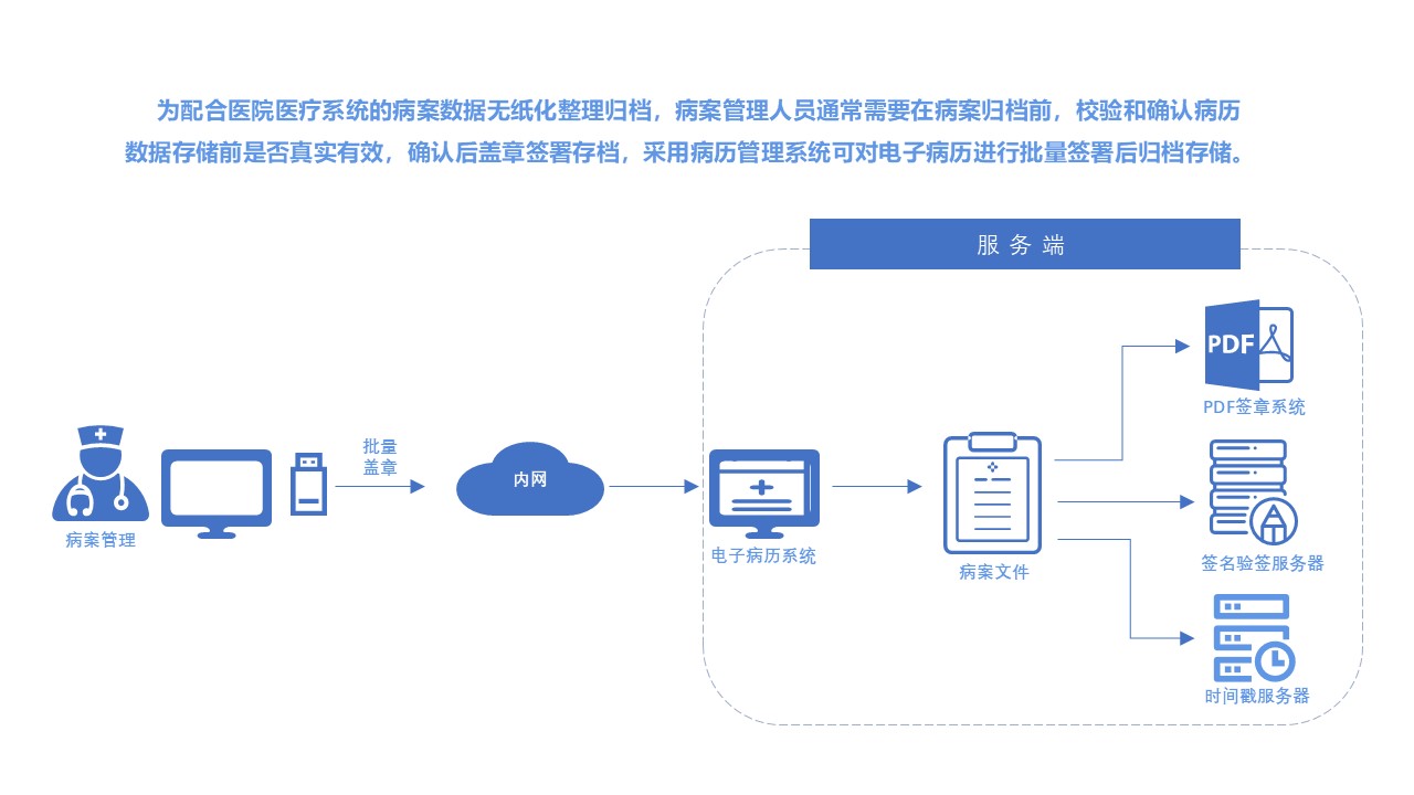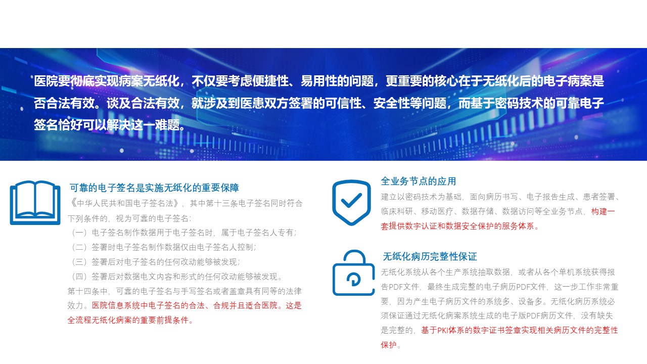 让医院彻底实现病案无纸化,不仅要考虑便捷性、易用性,更重要的核心在于无纸化后的电子病案是否合法有效,医患双方签署的可信性、安全性等问题。这些问题我们通过密码技术的可靠电子签名逐一进行解决。